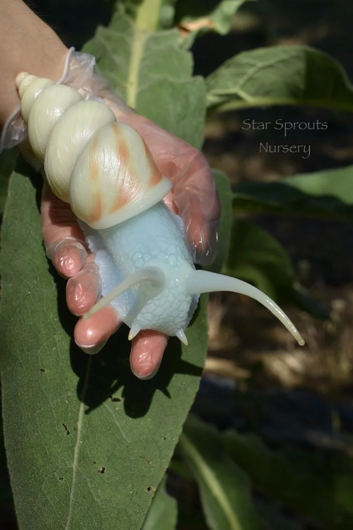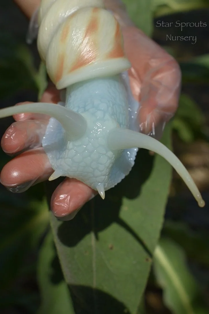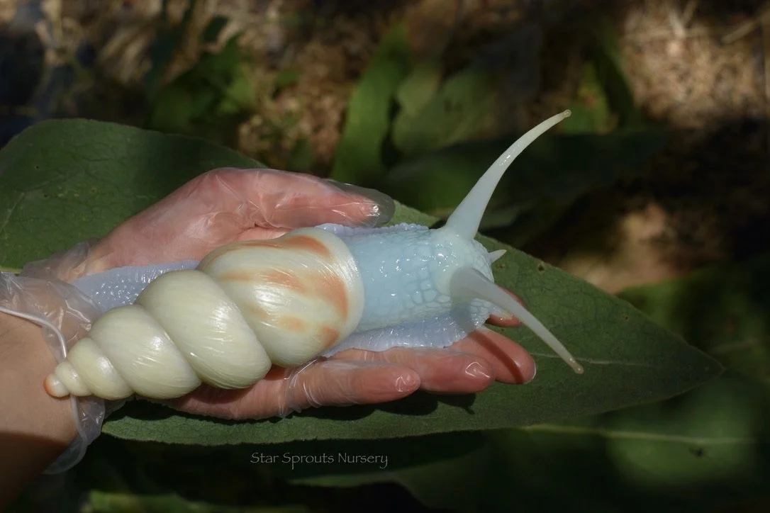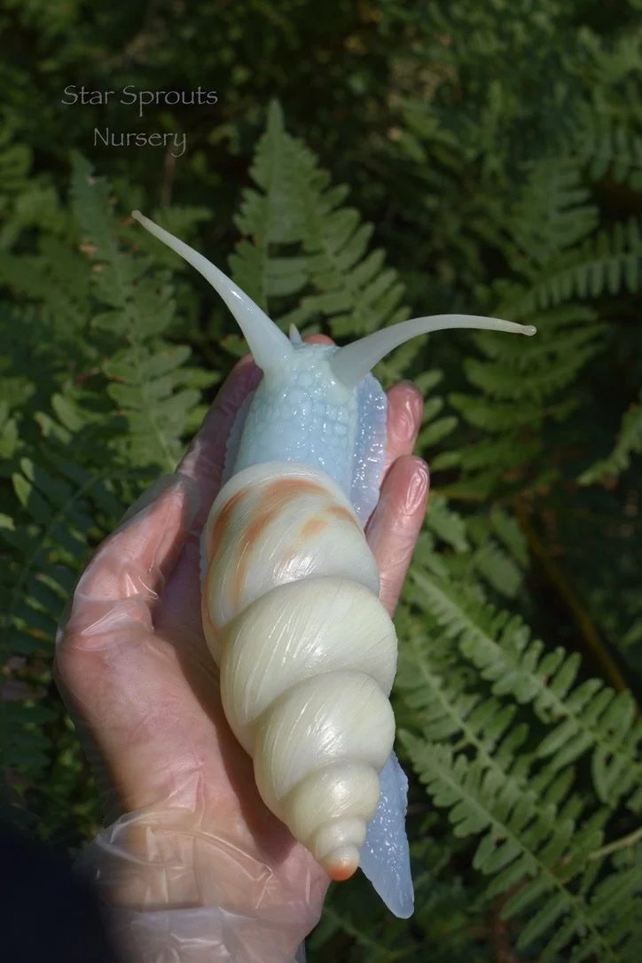 Ulysses is a soft silicone snail, made to resemble the beautiful living Green Tree Snail (Amphidromus sylheticus) shown in the first photo.
